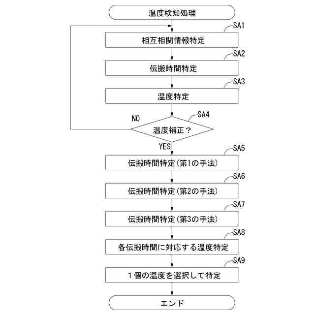 前記送波手段が送波した音波を前記受波手段が受波するまでの時間に基づいて、前記対象領域の温度を特定する温度特定手段と、