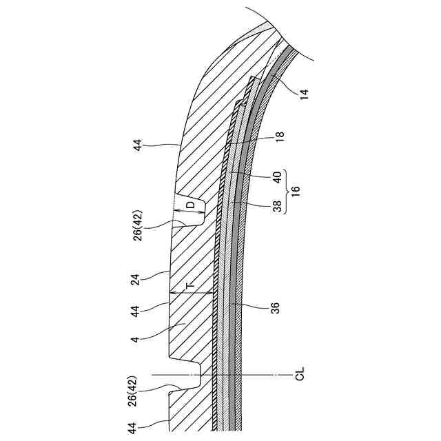 図1のタイヤのトレッドの近辺が示された拡大断面図である。