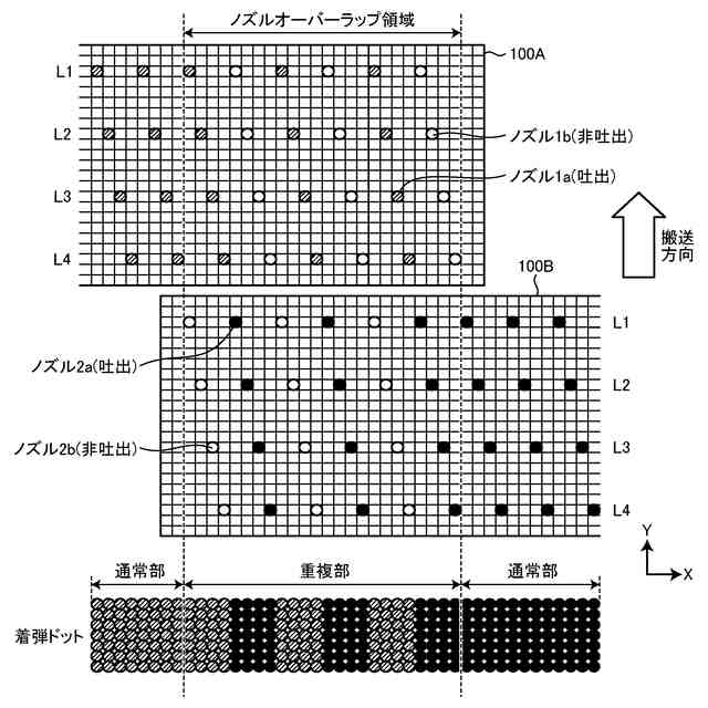 【解決手段】複数のノズルからなるノズル列を複数配列して前記ノズルから液滴を選択的に媒体へ吐出する複数のヘッドとノズルからの液滴の吐出を制御する制御部とを有し隣接する第1のヘッド及び第2のヘッドをノズル列の列方向の端部にノズルオーバーラップ領域を設けて設置する液体吐出装置において第1のヘッドの所定のノズル列のノズルと第2のヘッドの所定のノズル列のノズルはノズル列と直交する直線上に配置されノズルオーバーラップ領域において制御部はノズルから吐出される複数の液滴をノズル列と直交する方向に着弾する複数の液滴を第1のヘッドのノズルのみ又は第2のヘッドのノズルのみから吐出しノズル列において液滴を吐出する吐出ノズルと液滴を吐出しない非吐出ノズルを交互に配置し複数のノズル列に含まれる前記非吐出ノズルをノズル列に対して斜め方向に配置する。