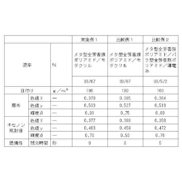 ここで、前記のメタ型全芳香族ポリアミド繊維およびモダクリル繊維は、公知のものでもよい。例えば、メタ型全芳香族ポリアミド繊維として帝人(株)製、商標名「Teijinconex」などが好ましく例示され、モダクリル繊維としては(株)カネカ製、商標名「プロテックス」などが好ましく例示される。また、メタ型全芳香族ポリアミド繊維およびモダクリル繊維のみで布帛を構成してもよいし、さらに他の繊維を含んでいてもよい。