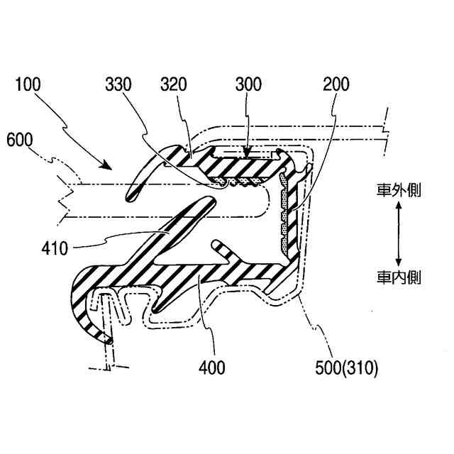 ところで、図4において、肉厚部330のドアガラス600の車外側面に当接する位置と、車内側シールリップ410のドアガラス600の車内側面に当接する位置を比較すると、車内側シールリップ410の方が車内側側壁400の先端側に位置している。