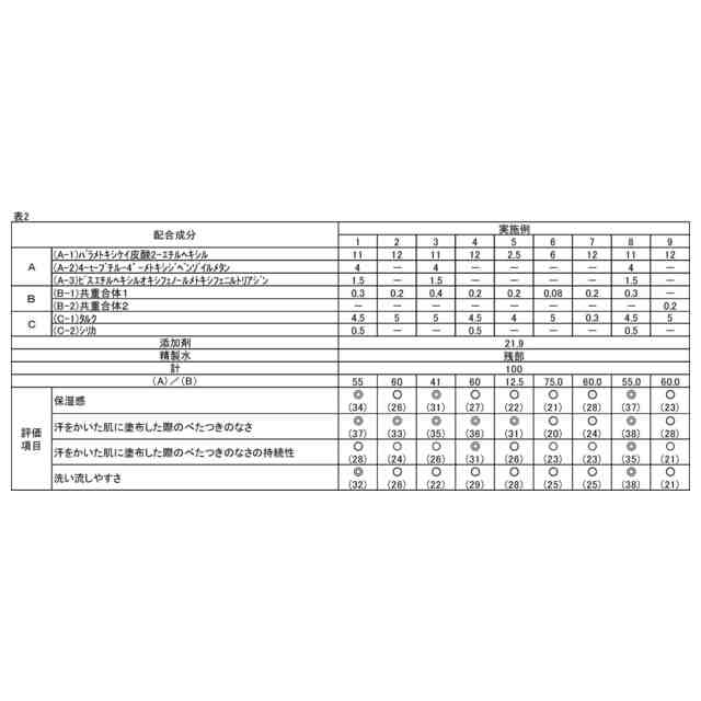 一方で夏場に日焼け止め化粧料を使用する際は、汗をかきべたついた肌に対して塗布する場面も想定される。日焼け止め化粧料以外の化粧料においては特許文献3のような、肌のべたつきを抑制し、さらさら感とその持続性を向上させるために、無水ケイ酸、カチオン性ポリマ-、ノニオン性ポリマ-、水を含む弱酸系の粉体含有化粧料が提案されている。しかし紫外線吸収剤は一般的にべたつきを引き起こしやすく、汗をかいた肌に塗布した際にもべたつかず、そのべたつきのなさが持続するような日焼け止め化粧料は開発されていなかった。