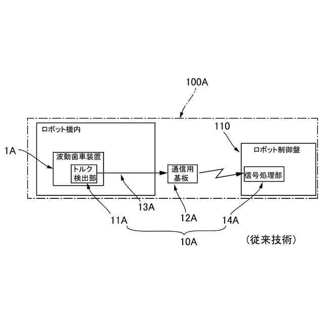 波動歯車装置は、各種機器の駆動部、例えば図1Bに示すように、作業用のロボットシステム100Aの関節部などのロボット機内に、減速機として組み込まれて使用される。この場合、負荷トルクの検出には、歪ゲージ式のトルクセンサ10Aが用いられることがある。歪ゲージ式のトルクセンサ10Aは、波動歯車装置1Aに組み込まれた歪ゲージ式のトルク検出部11A、ロボット機外に設置された通信用基板12A、ロボット制御盤110に搭載されているトルク検出用の信号処理部14A等から構成される。