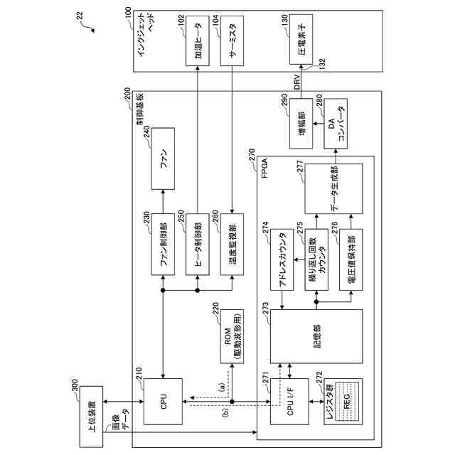 CPUは、駆動信号生成部からの要求に基づいて記憶部に記憶されたデータを駆動信号生成部に出力し、記憶部に記憶されたデータに基づいて所定の頻度でチェンジ信号を駆動信号生成部に出力する。駆動信号生成部は、CPUから受信するデータとチェンジ信号とに基づいて、電圧値が増加、減少又は維持される駆動信号を生成し、生成した駆動信号を吐出ヘッドに出力する(例えば、特許文献1参照)。