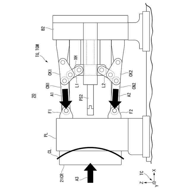 トグル式型締機構TGによる型締めが行われた場合において、プラテンPLに取り付けられた可動型21CRが撓んでしまうことを説明するための図である。