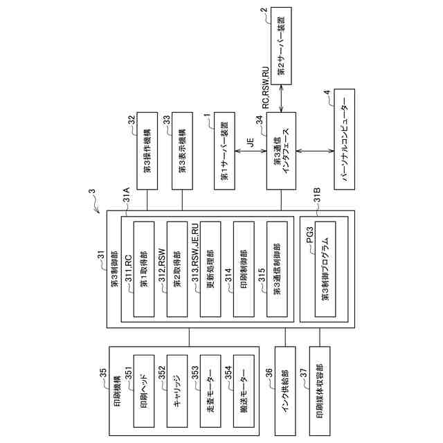 【解決手段】プリンター3は、プリンター3を管理する第1サーバー装置1、及びプリンター3の更新ソフトウェアRSWを記憶する第2サーバー装置2と通信可能に接続され、第1サーバー装置1から、ソフトウェアのアップデートの実行を要求する実行要求RQ1を取得する第1取得部311と、実行要求RQ1に応じて、第2サーバー装置2から更新ソフトウェアRSWを取得する第2取得部312と、ソフトウェアを更新ソフトウェアRSWにアップデートする更新処理部313と、を備える。