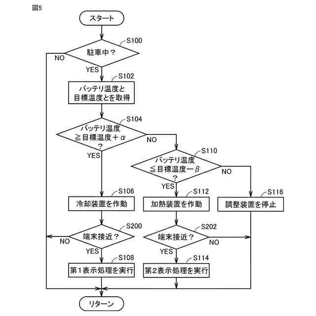 【解決手段】ECUは、駐車中に(S100にてYES)、バッテリ温度と目標温度とを取得するステップ(S102)と、バッテリ温度が目標温度+α以上であると判定される場合(S104にてYES)、冷却装置を作動させるステップ(S106)と、第1表示処理を実行するステップ(S108)と、バッテリ温度が目標温度-β以下であると判定される場合(S104にてNO、かつ、S110にてYES)、加熱装置を作動させるステップ(S112)と、第2表示処理を実行するステップ(S114)とを含む、処理を実行する。