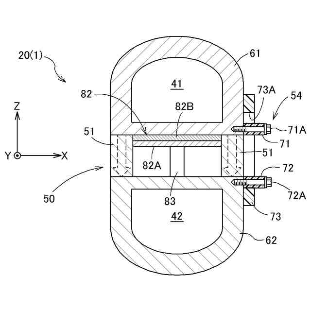 図1は、冷暖房システム1の回路構成を示した図である。冷暖房システム1は、車両に搭載され、図1に示されるように、冷媒モジュールB、冷却液モジュールC、及びHVAC(Heating, Ventilation, and Air Conditioning)ユニットDを備えている。冷媒モジュールBには冷媒路B1が設けられ、冷媒マニホールドとして構成されている。また、冷却液モジュールCには冷却液流路C1が設けられ、冷却液マニホールドとして構成されている。ここで、マニホールドは冷却液流路C1や冷媒路B1が切削または鋳造されたハウジング本体にプレート部材を積層して封止した流路ハウジングである。流路ハウジングはアルミニウムを含む熱伝導率の高い金属材料で形成されている。