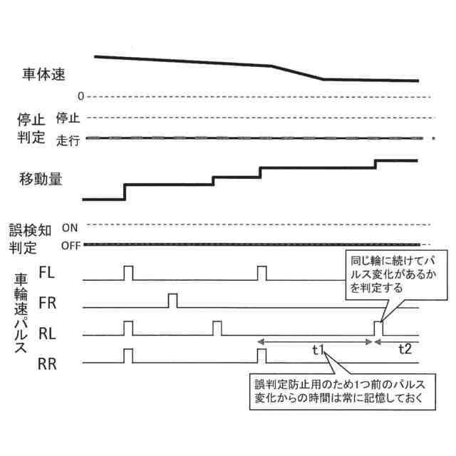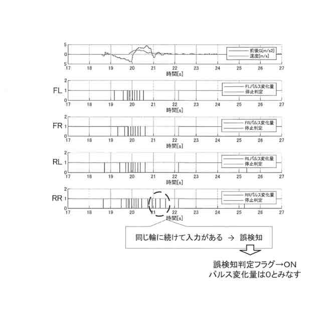 【解決手段】車両が備える複数の車輪の内、一部の特定車輪以外の車輪から車輪速パルスが取得されない状態で特定車輪のみから連続して車輪速パルスが取得された場合であって、且つ連続した車輪速パルスを取得したのが特定車輪以外の車輪から最後に車輪速パルスが取得されてから第1時間以上経過している場合に、特定車輪から車輪速パルスが誤って取得されている状態であることを示す誤検知判定フラグをオンし、誤検知判定フラグがオンされた状態では特定車輪から車輪速パルスの取得がされていないとみなして停止状態と走行状態の判定を行うように構成する。