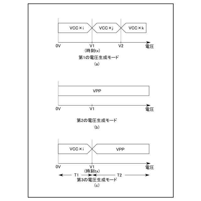前記電圧生成回路の動作モードは、前記第1の期間において前記第1の外部電圧を昇圧し、前記第2の期間において前記第2の外部電圧を降圧する、