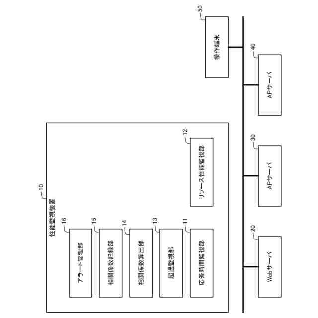 本実施形態における性能監視システムは、ウェブサービスを行うアプリケーションを構成するWeb3層であるWebサーバ(ウェブサーバ)20、APサーバ(アプリケーションサーバ)30、DBサーバ(データベースサーバ)40、を監視対象とし、応答性能劣化のアラートを通知する機能を有する。但し、性能監視システムによる監視対象は、上述したサーバに限定されず、いかなるウェブサービスを提供するサーバやサーバ群であってもよい。
