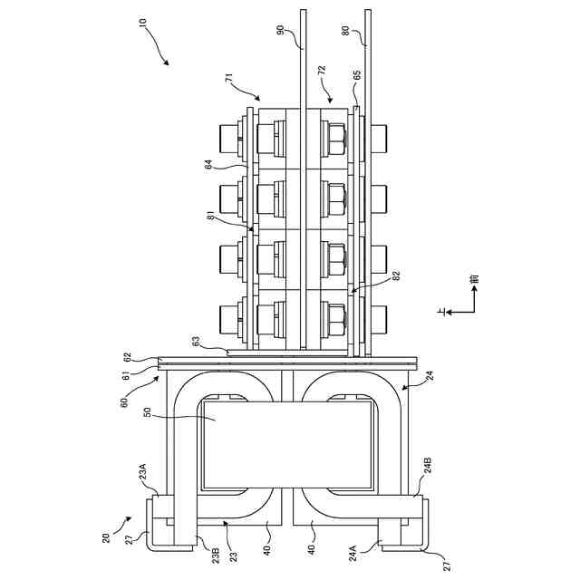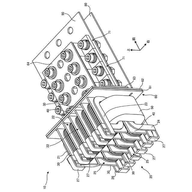 図1及び図2に示すように、本実施形態に係る電気機器10は、一次側のコイル20と、二次側の複数のコイル30と、二次側の複数のコイル40と、コイル20~40の中心の空間を貫く環状のコア50と、を備える。各要素20~50は、トランスを構成している。電気機器10は、接続部60と、複数のダイオード71及び72と、電極部品80及び90と、をさらに備える。接続部60は、図10の回路図のように、コイル30及び40の各一端31及び41(図5など。詳細は後述)と電極部品80とを接続し、かつ、コイル30及び40の各他端32及び42(図5など。詳細は後述)と電極部品90とをダイオード71及び72を介して接続する。このような接続の実現のため、接続部60は、板状部品61~65を含む。コイル20~40、接続部を構成する後述の板状部品61~65、電極部品80及び90は、金属製の導体からなるが、これらの電気的接続を意図しない部分には、適宜絶縁膜が配置される。当該絶縁膜としては、絶縁ワニス、絶縁紙などが挙げられる。電気機器10は、コイル20~40により交流電力を変圧(ここでは降圧)し、変圧後の交流電力をダイオード71及び72により全波整流する電力変換装置として構成されている。