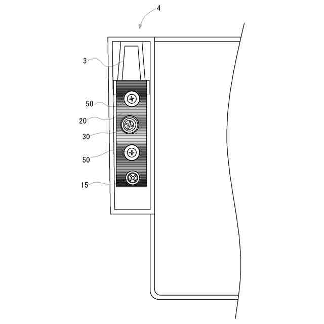前記可動板の前記他端側に回動可能に設けられる前板調整用ボルトが、前記固定板の前記他端側に形成されている前板調整用ネジ孔に螺合することによって、前記固定板の前記他端側と前記可動板との間隔を調整可能とする場合には、更に螺合を用いた簡易な構造で前板の傾きを容易且つ確実に調整可能である。また、前板調整用ボルトの頭部が可動板部分に配置されることによって固定板から突出することがなく、突起等が少ない優れた美観とすることができる。