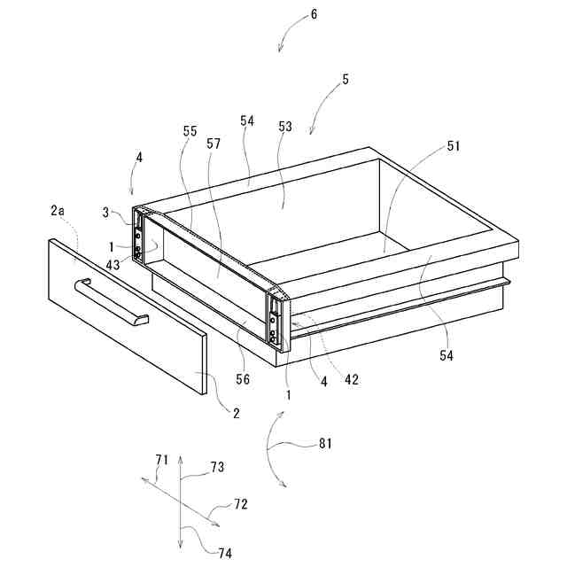 本引出し6は、図8に例示するように、前板2と、引出し本体5と、前板2と引出し本体5の間に設けられる前板調整ジョイント1とを備える。