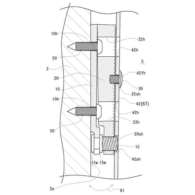 前板調整ジョイント1は、図1~図4に示すように、前板2の背面2aに固定される可動板10と、引出し本体5の前面板57に固定される固定板20とを有し、可動板10の一端側が固定板20の一端側に回動可能に連結されている。そして、固定板20の他端側が可動板10との間隔を調整可能に係止されることにより、引出し本体5に対する前板2の仰角方向(図4及び図8に示す方向81を参照。)の傾きを調整可能に構成されている。