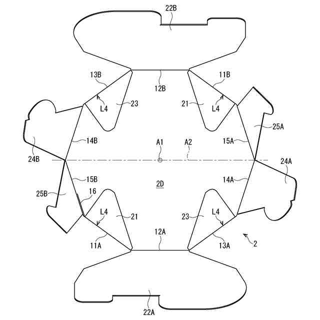 2組の前記第1~第5側壁(11~15)は、10本の折線(L1,L2)を介して前記周回方向に連設され、