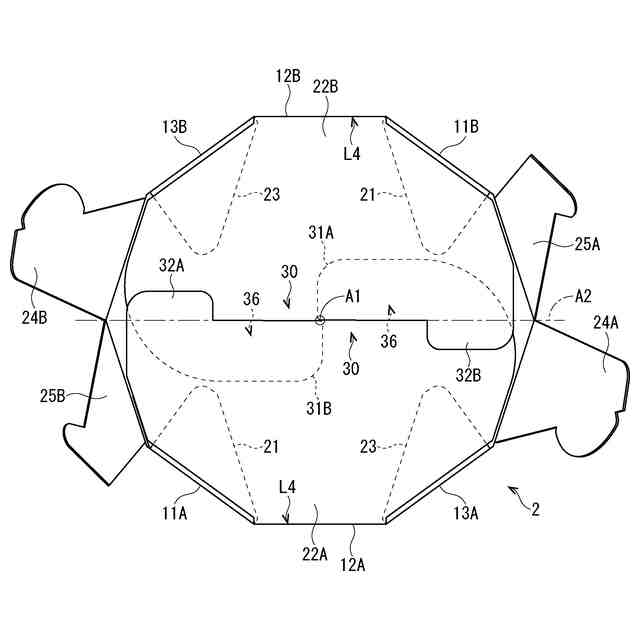一方の前記第2側壁(12A)、一方の前記第4側壁(14A)、他方の前記第1側壁(11B)、他方の前記第3側壁(13B)および他方の前記第5側壁(15B)は、それぞれ、隣り合う一対の前記垂直折線の上端から互いに接近するように斜め上方に延びた前記天面蓋部との境界としての一対の天面折曲線(L5)と、前記垂直折線と、前記傾斜折線と、自身の下縁とで五角形状に形成される凹面壁(18)を構成し、