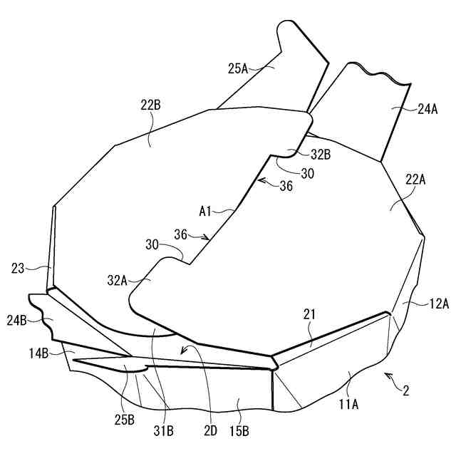 一方の前記第1側壁(11A)、一方の前記第3側壁(13A)、一方の前記第5側壁(15A)、他方の前記第2側壁(12B)および他方の前記第4側壁(14B)は、それぞれ、前記垂直折線と自身の下縁との成す角度が直角で、前記傾斜折線を斜辺とした直角三角形状に形成される凸面壁(17)を構成し、