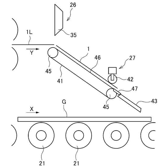 この合紙は、長尺状の合紙をロール状に巻回したロール紙から引き出され、切断機によってガラス基板の表面を覆う大きさに切断されてガラス基板に重ねられる(例えば、特許文献2,3参照)。