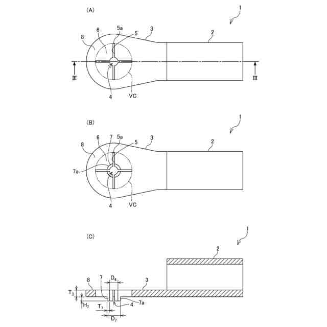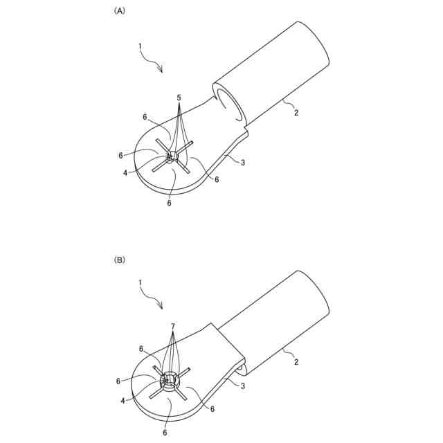 従来、機器等に設けられた穴に取り付けられる圧着端子として、丸形の圧着端子(丸端子、丸型端子、リング端子、R端子とも称される)が広く普及している。丸形の圧着端子は、挿入された電線が圧着されて強固に固定される筒状の部位(以下、「バレル部」と称する。)と、機器に結線される部位(以下、「舌部」と称する。)とを有しており、舌部には貫通孔が設けられている。この貫通孔に通されるねじが締め付けられることで、圧着端子が機器側の穴に固定される。