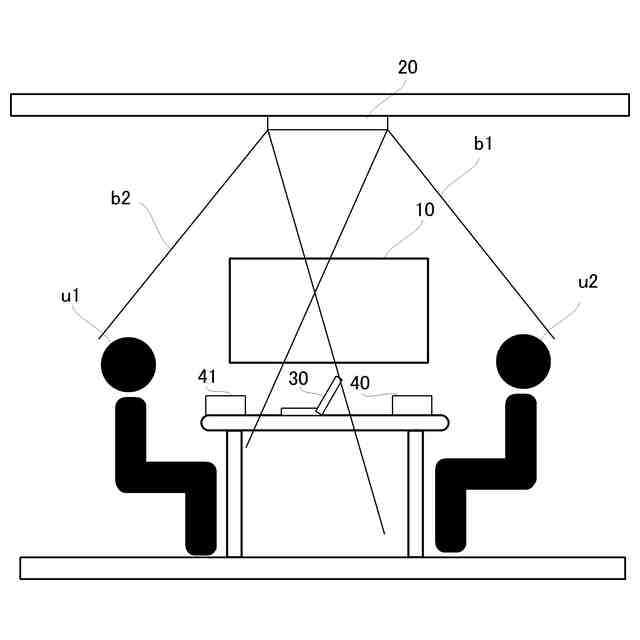 図2は、室内の立面図模式である。表示装置10は、一例として室内の壁面に設置されている。信号処理装置20は、一例として、天井に取り付けられる。机の周囲には、複数の利用者(利用者u1,u2)がいる。利用者u1の前の机上には利用者端末41が設置されている。利用者u2の前の机上には利用者端末40が設置されている。