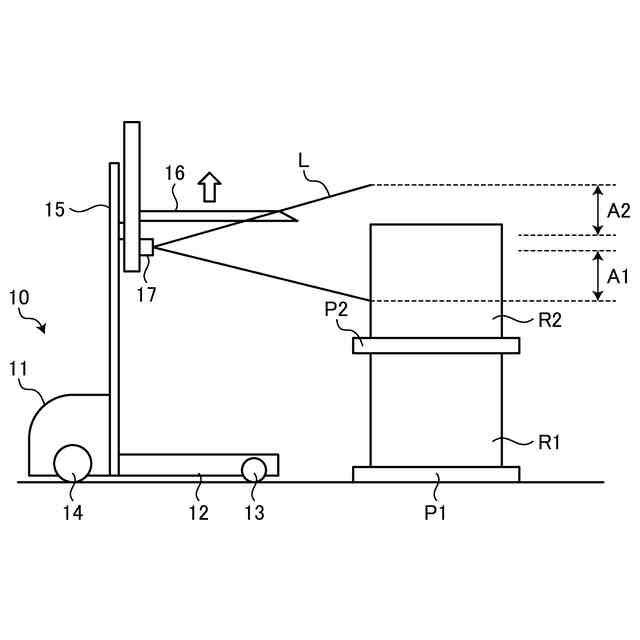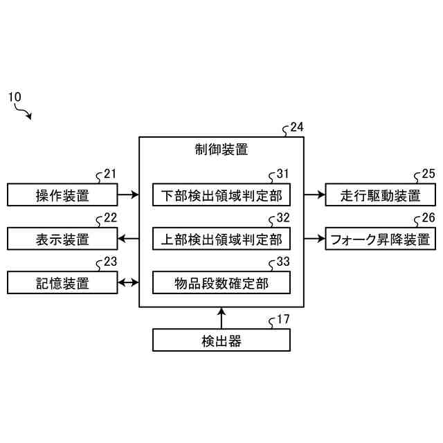 保管庫にて、パレット上に載置された物品が何段積み上げられているか不明な場合、事前に物品が積み上げられた段数を把握する必要がある。従来のフォークリフトは、フォークに検出器を設け、フォークの昇降時に検出器が物品の有無を検出することで、最上段の物品を検出し、物品が積み上げられた段数を把握する。ところが、検出器が物品の有無を検出するとき、フォークをゆっくりと昇降させる必要があり、物品が積み上げられた段数の把握に長時間を要してしまうという課題がある。