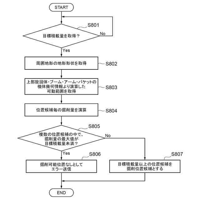 上記課題を解決するために、本発明の作業機械は、作業装置を有し、前記作業装置により対象物の掘削作業と運搬車両への積込作業を行う作業機械であって、前記作業機械を走行させる走行アクチュエータと、前記作業機械の周囲の地形形状を計測する地形計測装置と、前記運搬車両への目標積載量を取得する目標積載量取得装置と、前記作業装置の幾何情報を含む機体幾何情報と、前記地形計測装置により計測された前記地形形状と、前記目標積載量取得装置により取得された前記目標積載量に基づいて、前記掘削及び積込作業を行う時の前記作業機械の移動位置を決定し、前記作業機械を前記移動位置へ移動させるように前記走行アクチュエータを制御するコントローラと、を備え、前記コントローラは、前記地形形状と前記機体幾何情報に基づいて、複数の位置候補において前記掘削作業を行う時の前記対象物の掘削量を演算する掘削量演算部と、前記掘削量演算部で演算した前記複数の位置候補と前記掘削量の関係に基づいて、前記目標積載量以上の前記掘削量を確保可能な複数の掘削位置候補を演算する掘削位置候補演算部と、前記掘削位置候補演算部で演算した前記複数の掘削位置候補から前記作業機械の移動位置を決定する移動位置決定部と、前記移動位置決定部で決定した前記移動位置へ前記作業機械を移動させるように前記走行アクチュエータの制御指令を演算するアクチュエータ制御部と、を備えることを特徴とする。