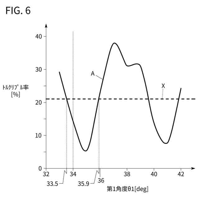 図6は、第1溝の第1角度とトルクリプル率との関係を示す特性曲線図である。
