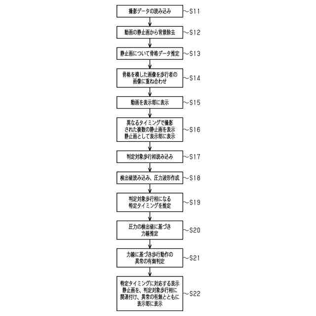 【解決手段】撮影部20は歩行者の歩行動作を撮影し、検出部25は足裏の複数の部位毎にかかる力の経時変化を撮影に同期して検出する。入力部34は、複数種類の歩行相からなる歩行周期のうち、判定の対象となる判定対象歩行相を指定する際に入力操作される。制御部35は、撮影部20で撮影された動画を表示部33に表示させ、動画を構成する複数の静止画の中から、互いに異なる複数のタイミングで撮影された複数の静止画を表示静止画として表示部33に表示させる。制御部35は、検出部25の検出値の経時変化に基づき、歩行者の歩行相が、入力部34の操作により指定された判定対象歩行相になるタイミングを特定タイミングとして推定する。制御部35は、複数の表示静止画のうち、特定タイミングに対応する表示静止画を、判定対象歩行相に関連付けた態様で表示部33に表示させる。