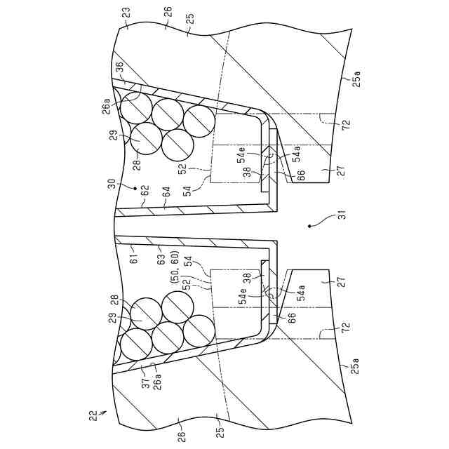 【解決手段】絶縁部材61は、絶縁本体部62の両端部からヨークの周方向の両側へ互いに離間する方向へ張り出す一対の抜け止め部68を有している。絶縁部材61は、抜け止め部68が、一対のインシュレータのうち一方のインシュレータにおけるヨークの周方向で隣り合うインシュレータティース部52の間からスロット内に挿入され、一対のインシュレータのうち他方のインシュレータにおいてインシュレータティース部52におけるティース鍔部27とはヨークの軸方向の反対側に位置する端面に対してヨークの軸方向で対向することで抜け止めされる。