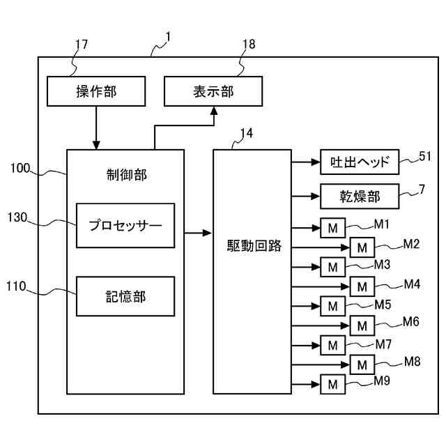 印刷装置1は、筐体2に媒体供給部3、印刷部5、乾燥部7、媒体回収部8及び制御部100が配置された構成である。筐体2は、印刷装置1の不図示のフレームに取り付けられ、上記の各部を収容する。媒体供給部3は、搬送部に相当する。