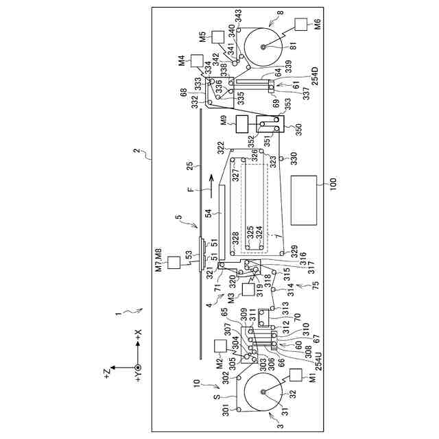 印刷媒体Sは、媒体供給部3と媒体回収部8との間を搬送路10に沿って搬送される。搬送路10には、印刷媒体Sに当接する複数の搬送ローラー301~343が配置される。搬送路10において、媒体供給部3から供給される印刷媒体Sは、図に矢印で示す搬送方向Fに搬送される。搬送路10において、搬送ローラー301~321は印刷部5の上流に位置する。これに対し、搬送ローラー322~343は印刷部5の下流に位置する。