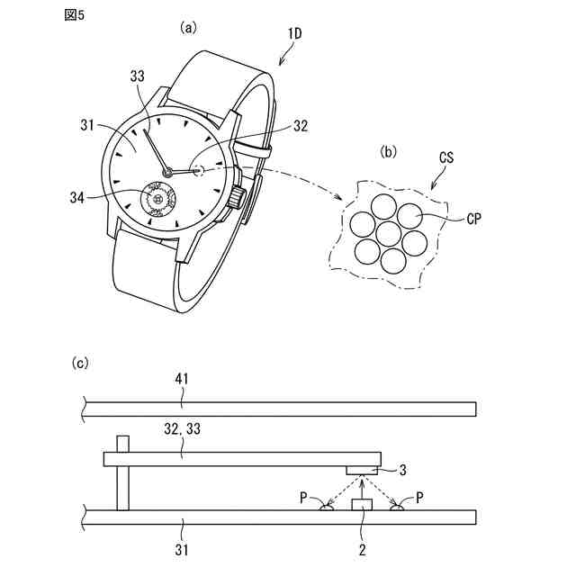 図5(a)は、本開示の光学的パターン表示物品の第4実施形態の斜視図であり、図5(b)は、図5(a)の破線領域のコロイド構造物の拡大図であり、図5(c)は、文字盤、短針及び長針、ケースの位置関係を説明する模式図である。