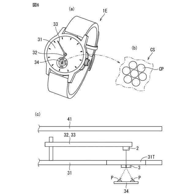 図7(a)は、本開示の光学的パターン表示物品の第6実施形態の斜視図であり、図7(b)は、図7(a)の破線領域のコロイド構造物の拡大図であり、図7(c)は、回動機構、文字盤、短針及び長針、ケースの位置関係を説明する模式図である。
