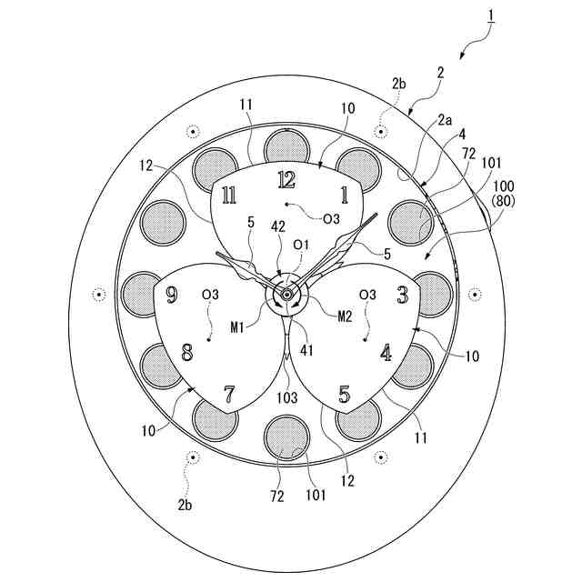 (2)複数の前記歯車は、前記第1回転体に第2軸線回りに回転可能に支持された複数の第1歯車と、前記第2回転体に第3軸線回りに回転可能に支持された複数の第2歯車と、を含み、前記装飾体は、複数の前記第1歯車のそれぞれに回転不能に取り付けられた第1装飾体と、複数の前記第2歯車のそれぞれに回転不能に取り付けられた第2装飾体と、を含んでも良い。