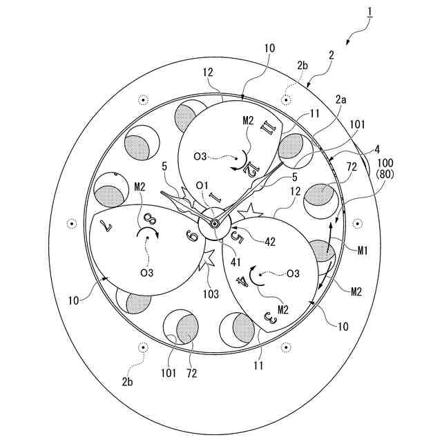 従来から、装飾体を移動させるからくり時計が知られている(例えば、特許文献1参照)。特許文献1に記載のからくり時計は、地板と、地板に対して相対回転する回転板と、回転板に回転可能に支持された複数の歯車と、複数の歯車にそれぞれ連結された複数の装飾体(装飾板)と、を備えている。複数の歯車のそれぞれは、地板に形成された外歯部又は内歯部に噛み合いながら、回転板の回転に伴って回転可能とされている。