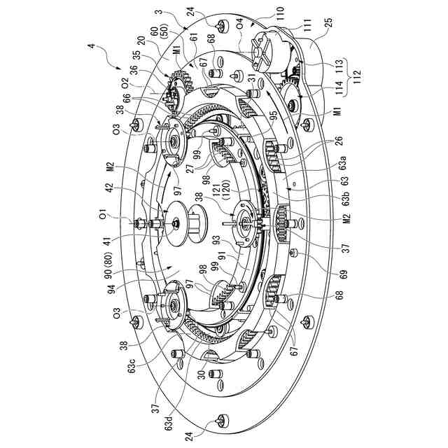 (1)本発明に係るからくり時計は、地板と、前記地板に対して、第1軸線回りに相対回転可能な第1回転体と、前記地板及び前記第1回転体のそれぞれに対して、前記第1軸線回りに相対回転可能な第2回転体と、第1回転方向に向けて前記第1回転体を回転させる回転駆動機構と、前記第1回転体の回転に連動させて、前記第1回転方向とは逆向きの第2回転方向に向けて前記第2回転体を回転させる連動機構と、を備え、前記第1回転体及び前記第2回転体のうちの少なくともいずれか一方の回転体には、前記第1軸線回りを周回する周方向に間隔をあけて配置されると共に、前記一方の回転体に回転可能に支持された複数の歯車が設けられ、複数の前記歯車は、前記一方の回転体の回転に連動して前記第1軸線回りを回転しながら、前記一方の回転体の回転方向と同じ回転方向に向けて自転し、複数の前記歯車のそれぞれには、装飾体が回転不能に取り付けられていることを特徴とする。