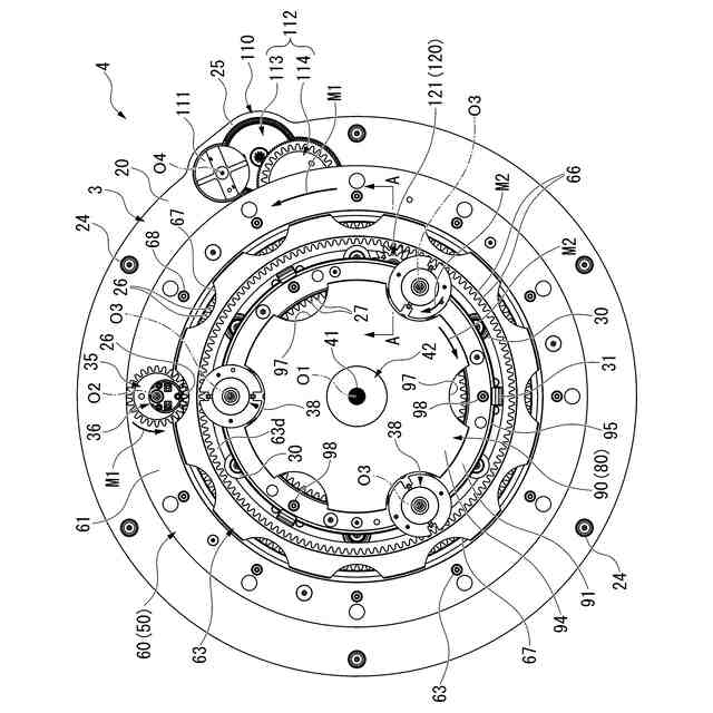 複数の前記第1歯車は、前記第1回転体の回転に連動して前記第1自転用歯部に噛み合いながら前記第1回転方向に回転し、且つ前記第1回転方向と同じ回転方向に向けて前記第2軸線回りを自転し、