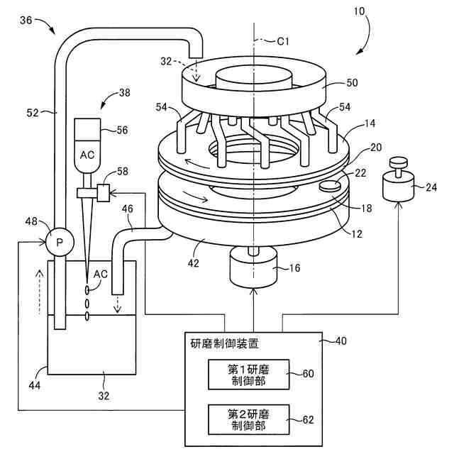 【解決手段】研磨液32にpH調整剤ACを滴下するpH調整剤滴下装置38が備えられ、研磨制御装置40は、研磨加工の開始から所定期間の間、pH調整剤滴下装置38からpH調整剤ACを研磨液32に滴下させて研磨液32のpHを強酸加工域に維持しつつ下研磨パッド18及び上研磨パッド20を回転駆動して半導体基板22の粗研磨を実行し、所定期間が経過してから研磨加工が終了するまで、pH調整剤滴下装置38からのpH調整剤ACの滴下を停止して研磨液32のpHを強酸加工域よりも高くしつつ下研磨パッド18及び上研磨パッド20を回転駆動して半導体基板22の仕上げ研磨を実行する。これにより、1つの研磨工程において、高い研磨効率と良好な表面粗さSaとが共に得られる。