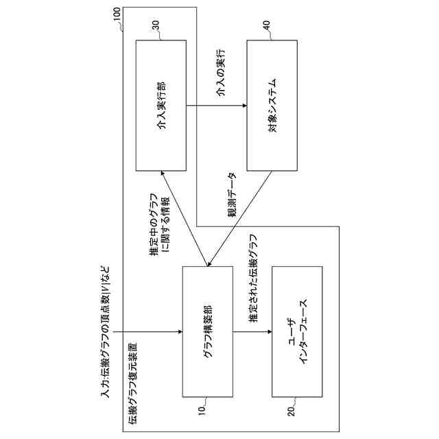 【解決手段】伝搬グラフ復元装置において、複数のコンポーネントを有する対象システムにおいて、各コンポーネントに対する確定的な挙動を示す事象の介入を決定する介入実行部と、前記介入の結果により得られる観測データに基づき、事象の連鎖的発生を記述する伝搬グラフを推定するグラフ構築部とを備える。