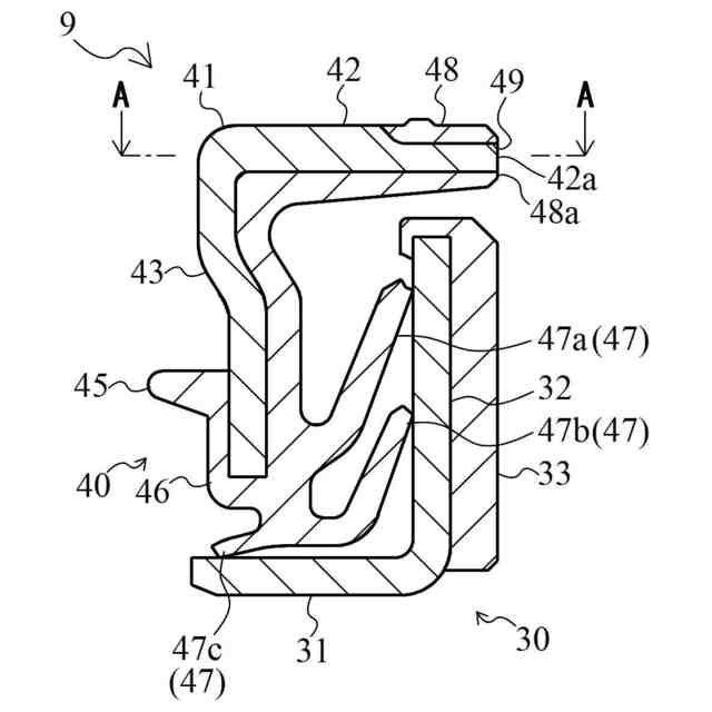 また、引用文献2の密封装置においては、第1弾性シールの第2円筒部の端部に外輪の環状凸部が軸方向外側から密着する構成にあたり、外輪の環状凸部に第1弾性シールの第2円筒部の端部が入り込んでいる。このため、第1芯金及び第1弾性シールと、第2芯金及び第2弾性シールと、の相対的位置が軸方向にズレることを抑制することが考えられる。もっとも、この密封装置においては、第1弾性シールは、第1芯金の円筒部の軸方向内側部分の内周面に密着している第1円筒部と、第1芯金の円筒部の軸方向外側部分の外周面に密着している第2円筒部と、第1芯金の円筒部の複数の貫通孔に挿入されて第1円筒部と第2円筒部とを連結する複数の連結片とを有することから、構造が複雑なものとなっていた。