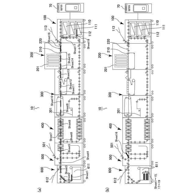 (a)は片面18枚ジョブを実行中のシート搬送状態を示す断面図、(b)は片面18枚ジョブが終了した状態を示す断面図。