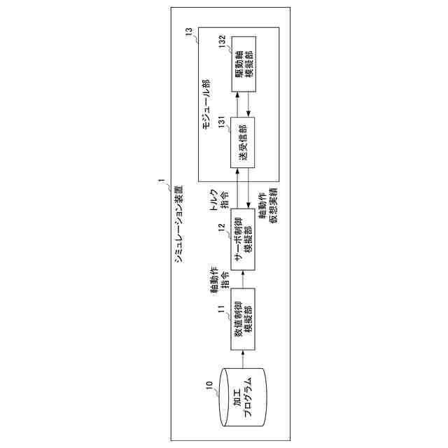 シミュレーション装置1は、数値制御模擬部11と、サーボ制御模擬部12と、モジュール部13と、を備える。