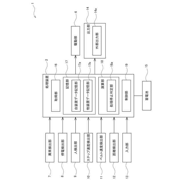 従来、例えば、マンコンベヤシステムは、複数のマンコンベヤと、監視装置と通信可能であり、互いに通信可能な複数の処理装置を備えている(例えば、特許文献1)。ところで、特許文献1におけるマンコンベヤシステムにおいては、複数の処理装置のうち、一つの処理装置の処理が停止した場合に、当該処理停止を示すデータを監視装置へ出力することができない。