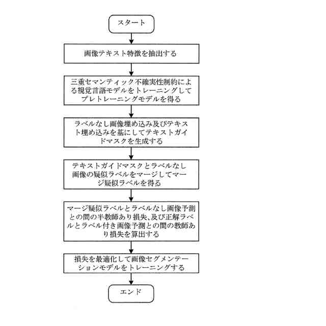 【解決手段】視覚言語モデルに基づく半教師あり医用画像セグメンテーション方法は、医用画像を取得するステップと、ラベルなし画像及びテキスト記述を視覚言語モデルに入力し、得られた密な画像埋め込み及びテキスト埋め込みを基にしてテキストガイドマスクを得るステップと、ラベル付き画像を生徒モデルに入力して得られたラベル付き画像予測を使用して教師あり損失を算出するステップと、ラベルなし画像を生徒モデル及び教師モデルに夫々入力してラベルなし画像予測及び疑似ラベルを得、テキストガイドマスクと疑似ラベルとをマージし、マージ疑似ラベル及びラベルなし画像予測を使用して半教師あり損失を算出するステップと、教師あり損失及び半教師あり損失に基づきトレーニングした生徒モデルを用いて医用画像セグメンテーションを行うステップと、を含む。