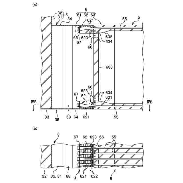 スラブ31は、鋼板を組み合わせることにより形成されており、底面に設けられたスラブ用底鋼板33と、上面に設けられたスラブ用上鋼板34とを備えている。スラブ31は、本体部32の外形よりも十分に大きな外形を有している。また、スラブ31は、ビーム5に向けて突出したビーム接合部35を有している。ビーム接合部35は、ビーム5と同等の外形(本実施形態では角筒状)を呈した鋼材により構成されている。