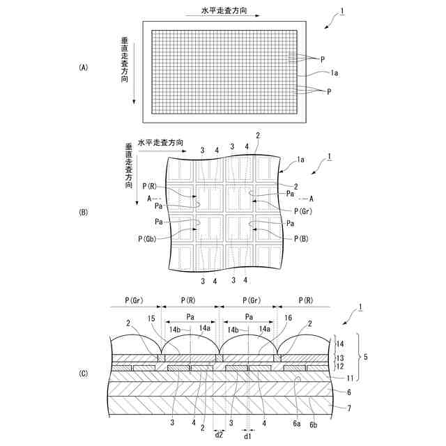 複数の画素Pのそれぞれには、光電変換部3および光電変換部4が設けられている。画素領域1aの法線方向から見た場合に、1つの画素開口Paの内側には、光電変換部3の少なくとも一部および光電変換部4の少なくとも一部が配置される。光電変換部3および光電変換部4は、それぞれ、画素開口Paを通った光を電荷に変換する。
