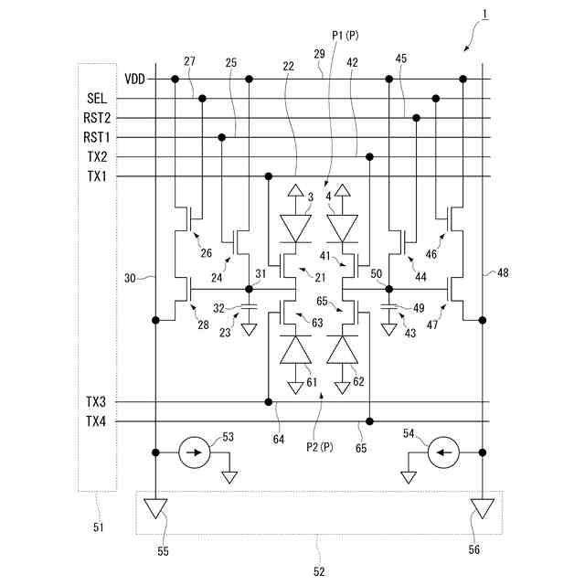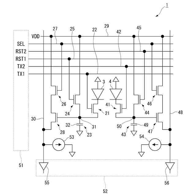 【解決手段】撮像素子は、第5トランジスタと第6トランジスタとに制御信号を出力する第1制御線を備える。撮像素子は、第7トランジスタと第8トランジスタとに制御信号を出力する第2制御線を備える。撮像素子は、第1トランジスタと第3トランジスタとに第1信号線を介して電流を供給する第1電流源を備える。撮像素子は、第2トランジスタと第4トランジスタとに第2信号線を介して電流を供給する第2電流源を備える。