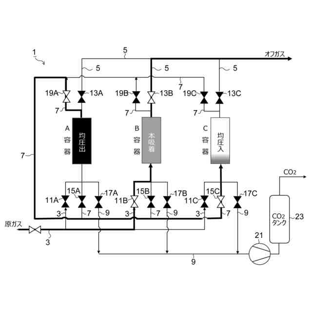 【解決手段】本発明に係る二酸化炭素回収方法は、2つの容器を直列に連結して二酸化炭素を吸着する吸着工程と、該吸着工程の後、前記2つの容器の連結を切り離し、破過した吸着材が充填されている容器の出口と脱着によって減圧された3つ目の容器の入口を連結して、連結された2つの容器の均圧と、破過した充填材が充填されている容器内の二酸化炭素濃度の濃縮と、破過した充填材が充填されている容器から流出する二酸化炭素の前記3つ目の容器での捕捉と、を行う均圧・濃縮・捕捉工程と、均圧・濃縮・捕捉工程に使用する2つの容器以外の一つの容器で行う吸着継続工程と、回収工程と、を備え、前記吸着工程と、前記均圧工程と、前記吸着継続工程と、前記回収工程と、を繰り返して行うことを特徴とする。