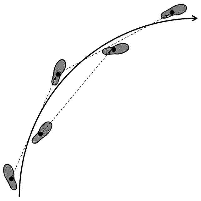 前記始点および前記終点を通る直線と前記始点における前記進行軸とが水平面において成す角度に相当する相対角度と、前記始点における前記進行軸と前記終点との水平面における距離に相当する相対変位とを前記相対変化値として計算し、